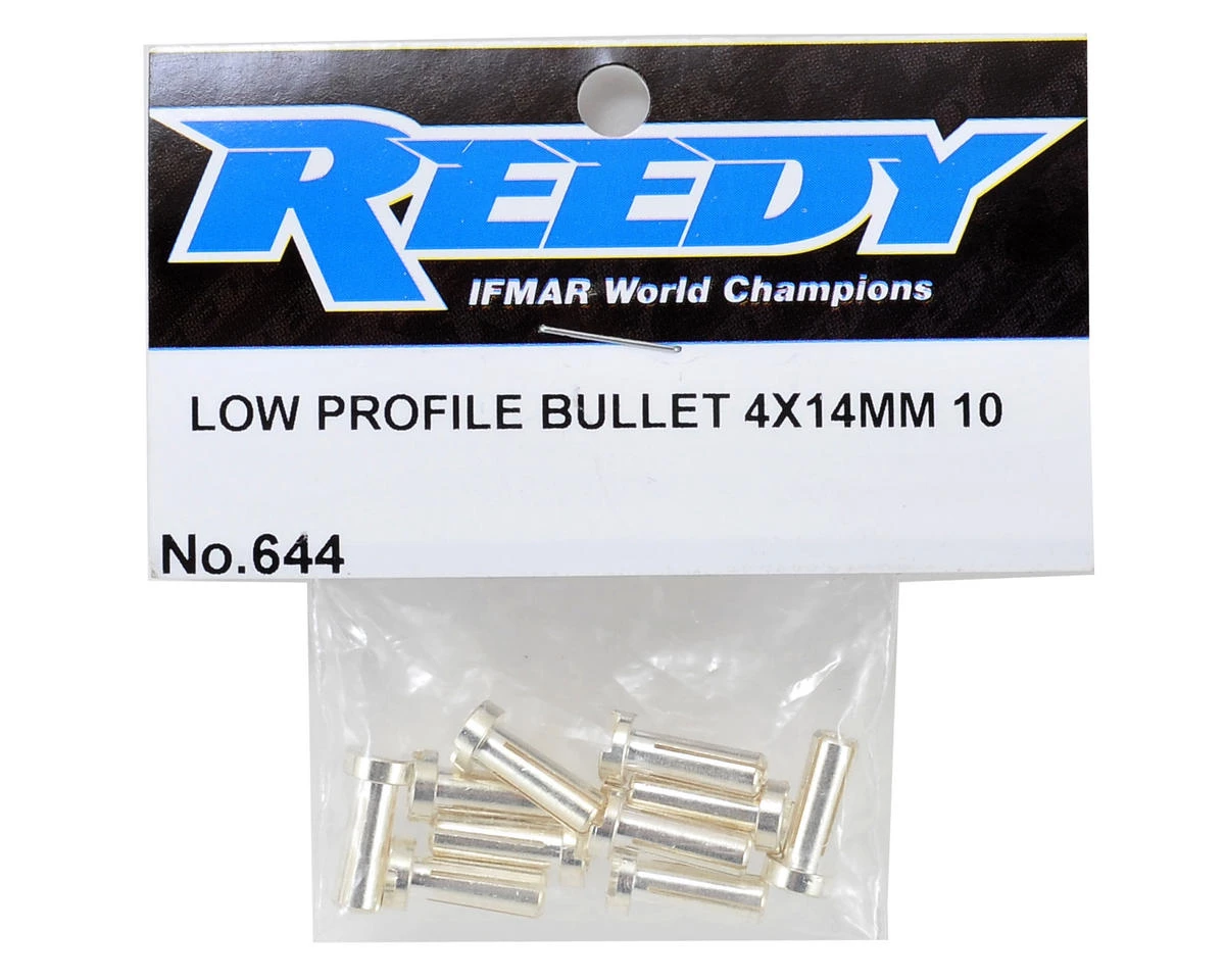 This is a pack of ten Reedy 4mm Low-Profile Bullet Connectors. Reedy’s low-profile bullets feature a flat top for easy soldering, with four contact points and silver plating for a low resistance connection. 14mm length allows compatibility with most socket style batteries that use a 4mm diameter socket. Package includes ten male connectors.