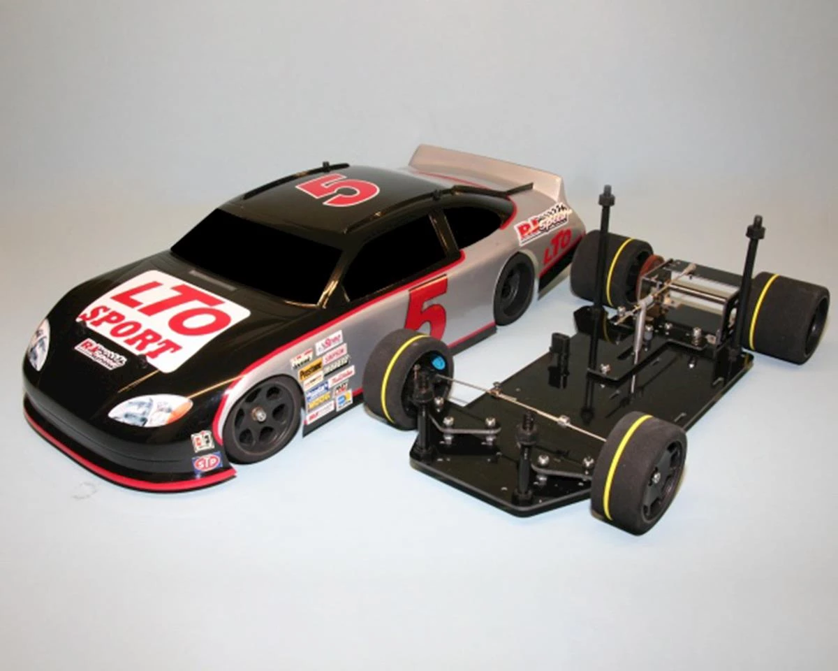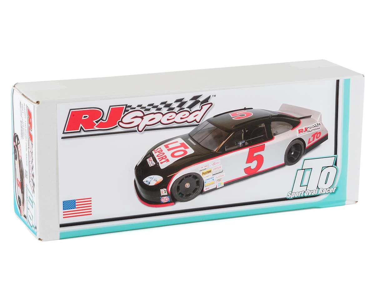 The RJ Speed 1/10 LTO Sport Oval Racer Kit is a 1/10 scale Electric oval racing kit that features a composite fiberglass chassis with adjustable wheelbase, caster and camber, ball diff, t-plate with tweak springs, adjustable axle height, spec racing tires, gears, steering linkage and a clear 2012 stock car body with molded in rear spoiler, window masks and protective film.