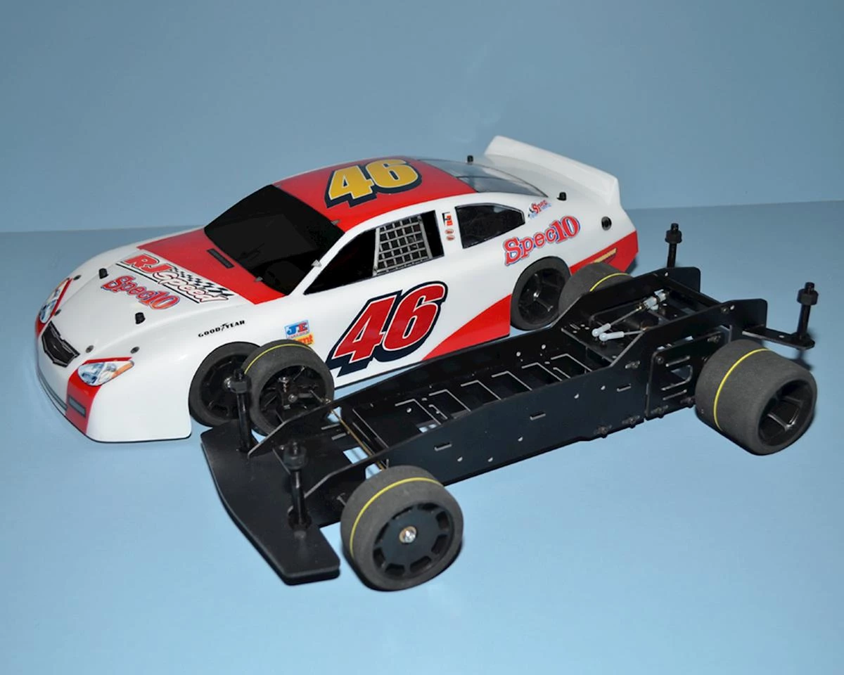The RJ Speed 1/10 Spec 10 Oval/Road Racer Kit is a 1/10 scale composite fiberglass chassis kit. It uses a ladder style chassis, with a simple, yet effective adjustable rear suspension. The rear suspension allows the car to handle better on a larger variety of surfaces, including carpet, asphalt, and smooth packed dirt ovals.
