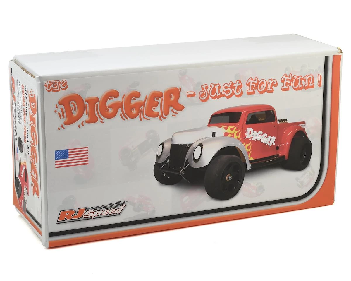 The RJ Speed Digger Fun Truck Kit includes all the parts you need to build a rolling chassis. Get ready to have fun, with a simple, easy to assemble kit that is perfect for enthusiasts of all ages! All chassis parts, tires, gears, linkage, and clear coupe body with window masks and protective film are included, so all you need to add is your electronics! It requires a 540 or 550 size motor, an ESC with reverse, 6 cell stick or 2S LiPo battery pack, and a 2 channel radio system with one servo.